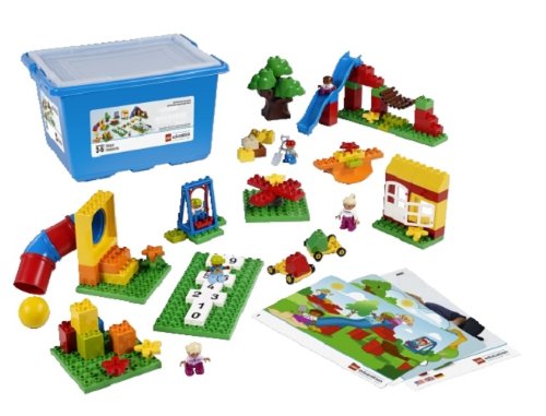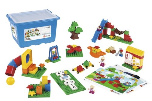 The LEGO Education 745001 104-piece DUPLO playground set includes the components for constructing an interactive playground scene with several elements to help develop students' understanding of shape, color, position, and numeracy. The set comes with two building cards and a teacher booklet, which guide students through assembly and provide opportunities for role playing and problem solving. DUPLO blocks are twice as large as standard LEGO bricks to better accommodate preschool-age children. The set supports a group of four students, ages two to five years, and comes in a plastic storage container with a transparent lid.