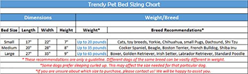 -. Feature : Trendy Designer Pattern & Colors: Trade in drab for fab! No more embarrassingly ugly pet beds. Now your feline & K-9 kids can rest in stylish luxury. / Thick, Bolstered & Ultra-Soft: Hefty, reinforced microtec center holds strong against sharp teeth and nails, while high-quality, super-soft microfiber offers luxurious comfort. / All-in-One, Easy to Clean: The one-piece Trendy Pet bed cleans up in a snap. Toss the entire bed into the washer, tumble dry and it's ready for use, no reassembly required! / Small, Medium and Large Sizes: Small measures 17" x 22" x 7", for cats & toy dogs. Medium measures 20" x 28" x 8" for medium-sized pets, and Large measures 27" x 35" x 9". These are OUSIDE DIMENSIONS! / 30-Day, Money-Back Guarantee Plus Free Shipping: If you aren't 100% satisfied, we'll refund your purchase right away, no questions asked.