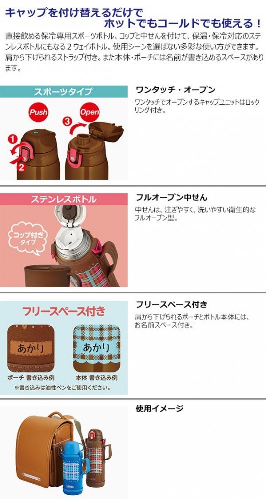 直接飲める保冷専用スポーツボトルと、コップと中せんを付けて、保温・保冷両用にもなるステンレスボトルの2ウェイです。使用シーンを選ばない多彩な使い方ができます。ポーチには肩にやさしい幅広のストラップが付いています。また本体・ポーチには名前が書き込めるフリースペース付き。 |