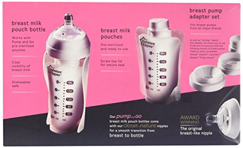 Choosing to pump gives you back some well-deserved freedom and flexibility, but the whole process can get messy and complicated. Our Pump and Go range makes everything easier. By using a single pouch to pump, store, warm and feed, there's no need to transfer milk at any stage, so you'll never lose a precious drop! Key FeaturesFits Pump and Go pouches This unique, Breast Milk Pouch Bottle from the Tommee Tippee Pump and Go range is the perfect fit for Pump and Go pouches. Simply click pouch into the bottle so your baby can enjoy every drop! Pouch fits directly to pump This unique Breast Milk Pouch from the Tommee Tippee Pump and Go range can connect to most breast pump brands such as Medela, Lansinoh, Evenflo, Ameda, Philips Avent, Tommee TippeeOriginal breast-like Nipple The Pump and Go Breast Milk Pouch connects directly to a breast milk pouch bottle with a Closer to Nature Slow Flow Nipple for a smooth transition from breast to bottle Super Sensitive Easi-Vent valve The Closer to Nature Slow Flow Nipple with a super-sensitive valve eliminates excessive air flow, so little ones ingest more milk and less airPump and Go System Tommee Tippee's new Pump and Go system uses a single pouch to pump, store, warm and feed. By removing the need to decant, we're hoping to make life simpler and guarantee you'll never lose a precious drop. Baby Safe The Tommee Tippee Pump and Go Starter Set is BPA-free / phthalate-free for total reassurance.