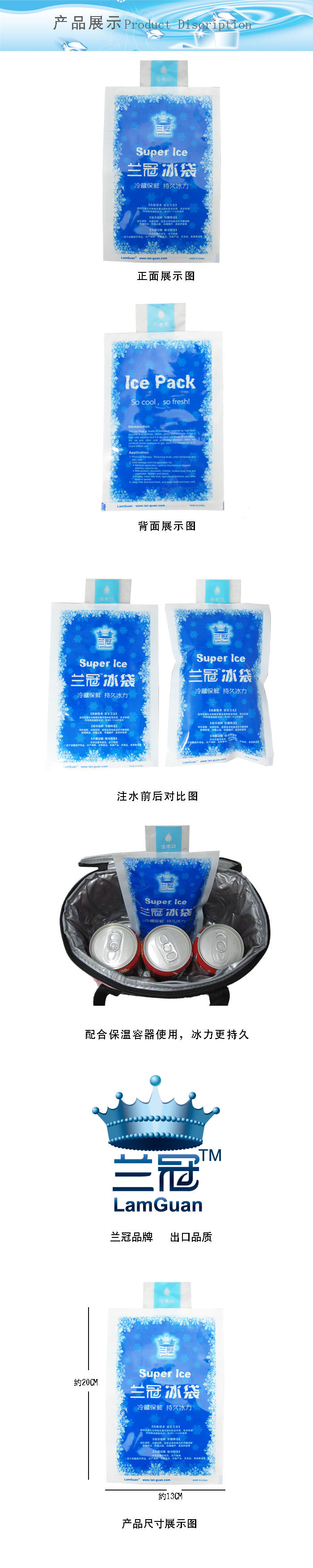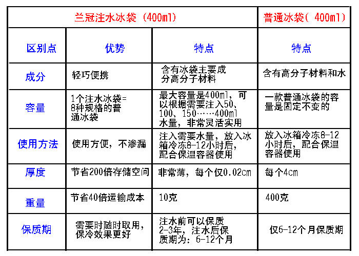 To start using this ice pack, please input 400 mL of water and leave the ice bag upward for few minutes. The ice pack will be self-sealed and the contents inside will be changed to gel, then store it in freezer for 8-12 hours. The product can be re-used for around 1000 times.