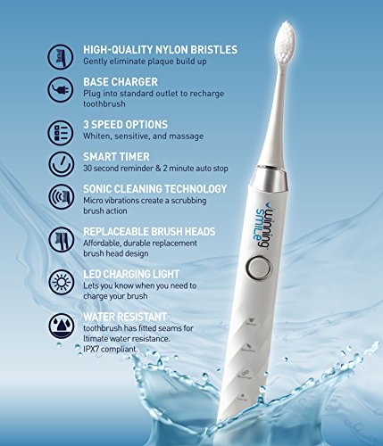 -. Feature : RECHARGEABLE TOOTHBRUSH WITH SMART TIMER. Automatic toothbrush with smart timer makes brushing easy. / SONIC TECHNOLOGY. Sonic toothbrush offers best cleaning technology with scrubbing brush action. / FULL KIT. Best electric toothbrush includes floss picks, toothbrushes, mouth guard, tongue scraper & toothpaste squeezer. / BPA-FREE. This electronic toothbrush for adults features ultrasonic brush heads with high-quality nylon bristles for safe brushing. / MULTI-SPEED. Customize your oral hygiene regime with 3 sonic toothbrush modes sensitive, massage, and whiten.