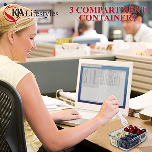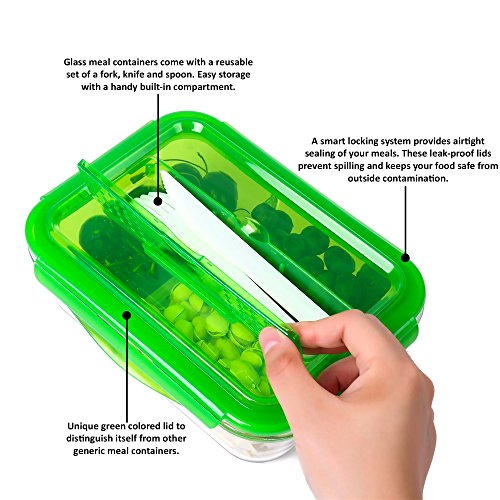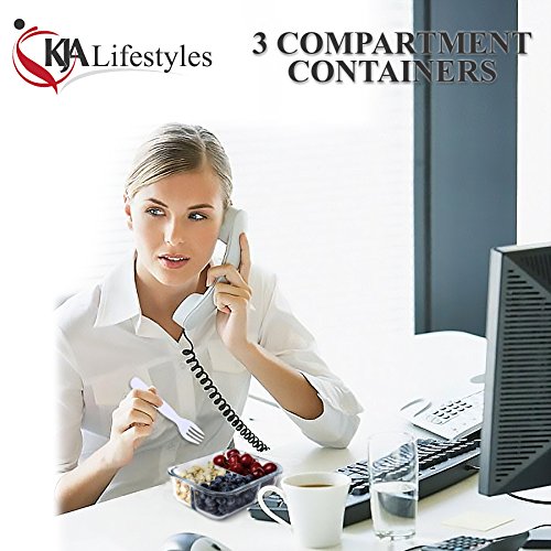 HAVE LUNCH, SALAD AND A DESSERT: These must have meal prep containers feature 3 separate compartments which offer you countless possibilities. The 32oz capacity allows you to store your lunch, your salad and your dessert in one. Moreover, the airtight, securely sealing lids will keep your meal fresh and tasty for hours. Eat anywhere on the go with a bonus reusable cutlery set in each lid.