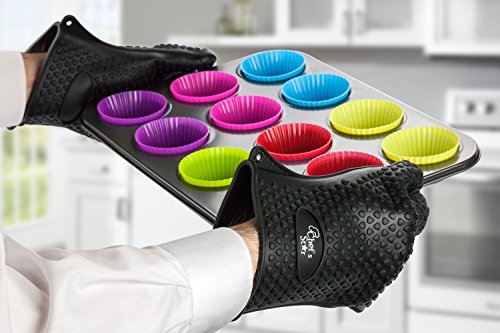 Chefs Star Carbon Steel Cupcake Baking Pan with Removable & Reusable Silicone Cupcake Liners, 12 Silicone Non-Stick Cups, Oven Safe, Heat Resistant, Plus Heat Resistant Heavy Silicone Cooking Gloves