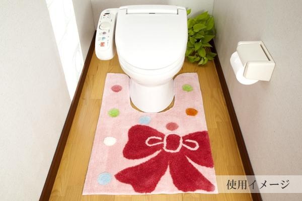 大きなリボン柄がキュートなトイレマットです。サイド横の奥まで長いサイズで、裏面に滑りにくい加工を施しているので、横ズレしにくいです!!