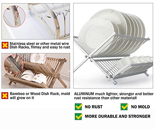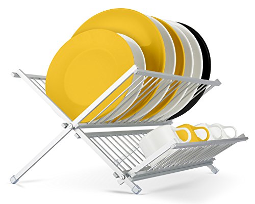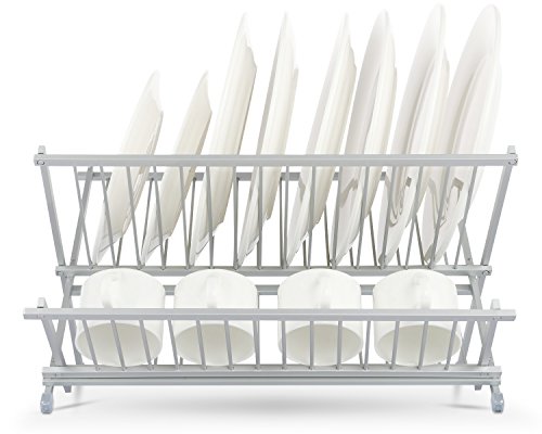 Studio : Miusco Publisher : Miusco Product Description Miusco Aluminum 2-tier Foldable X Shape Dish Drying Rack is a nice addition to your kitchen decor and is an environmental friendly choice to organize your dishes, bowls, cups and other kitchen utensils while they dry after washing. The 2-tier design allows for plates to be dried on top, while cups and bowls dry on the bottom. The X-shaped design allows you easily fold the rack to store it when you are done.