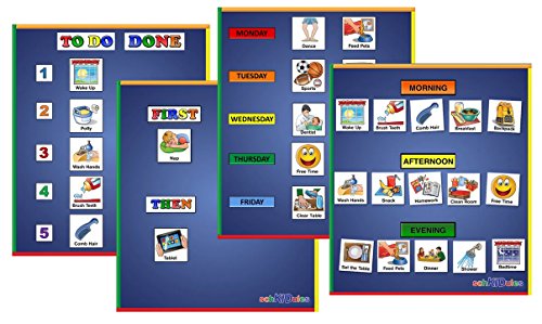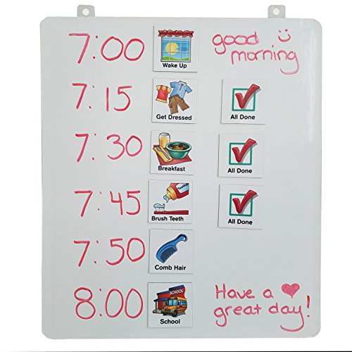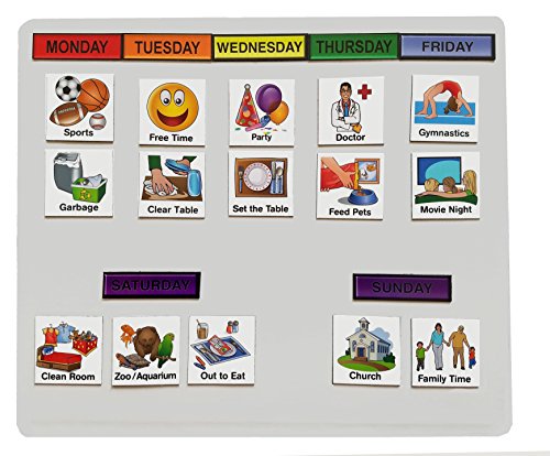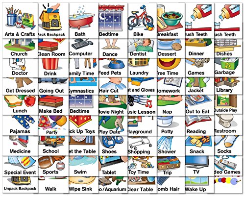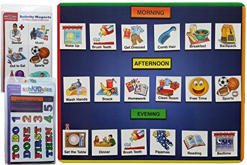 Studio : SchKIDules Visual Schedules Publisher : SchKIDules Visual Schedules Binding : Toy Product Description Set includes: (1) SchKIDules heavy duty 14x12 board, (1) 72 Piece Home Collection, (1)19 Piece Headings Sheet and 2 adhesive hang tabs. Home Collection magnet list is: arts and crafts, bath, bedtime, bike ride, breakfast, brush teeth (x2), church, clean room, clear table, comb hair, computer, dance, dentist, dessert, dinner, dishes, doctor, drink, family time, feed pets, free time, games, garbage, get dressed, going out, gymnastics, haircut, hat/gloves, homework, jacket, laundry, library, lunch, make bed, medicine, movie night, music lesson, nap, out to eat, outside play, pack backpack, party, pick up toys, pajamas, play date, playground, potty, reading, restroom, school, set table, shoes, shopping, shower, snack, socks, special event, sports, swim, tablet, therapy, toy time, trip, TV, unpack backpack, video games, wake up, walk, wash hands, wipe sink, zoo/aquarium. 0