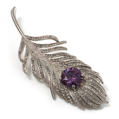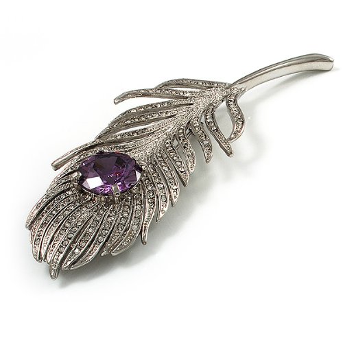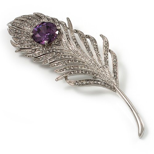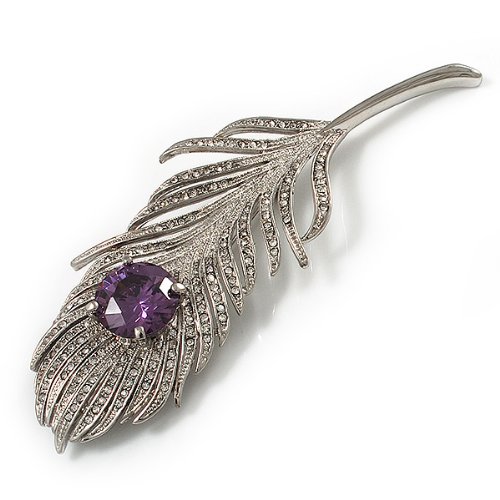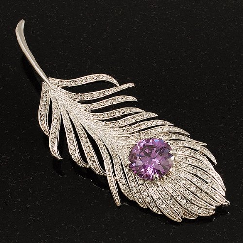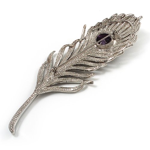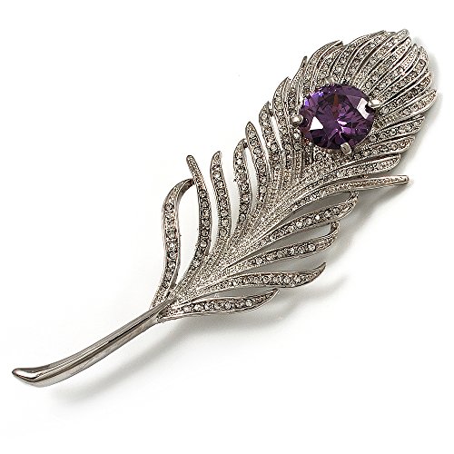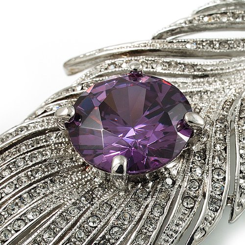 Escape to a world where fantasy reigns. This whimsical design displays a sparkling array of clear Swarovski crystals that add a bold confidence to your favourite looks. The large round-cut purple CZ stone claw-set at the centre of the oversized feather. The piece crafted in rhodium plated finish and measures about 11.5cm x 3.8cm. It secures with a flag pin and revolver clasp. Fantastic gift idea - Christmas, birthday, anniversary, mothers day, etc. Easily fastens to any bag, hat, coat or jacket.Feature