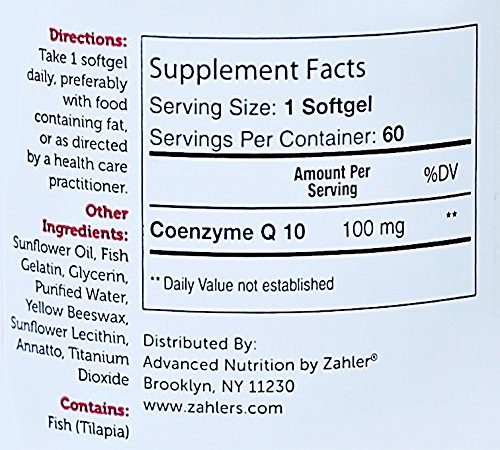 Studio : Advanced Nutrition by Zahler Publisher : Advanced Nutrition by Zahler Binding : Health and Beauty Product Description Zahler's CoQ10 is a pure Coenzyme Q-10 which is a great cellular energizer. CoQ10 or ubiquinone is found in the mitochondria of every healthy cell in the body, and is essential for energy production and healthy cellular function. A powerful antioxidant, Zahler's co Q-10 is derived from the finest sources to ensure purity and potency. These high grade liquid gelcaps are made in the USA and manufactured and bottled in a state of the art GMP Certified facility. 0