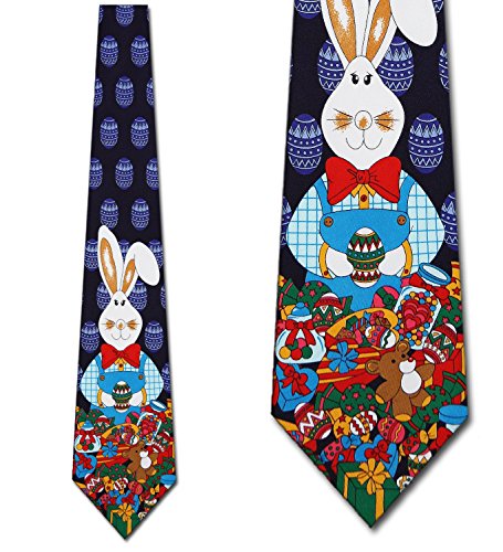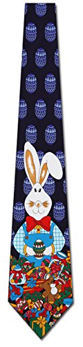 Binding : Apparel Product Description The big Easter Bunny tie features a cute rabbit holding an Easter Egg in front of Easter gifts and candy, with an allover Easter Egg background.
