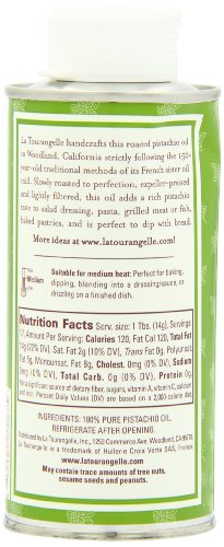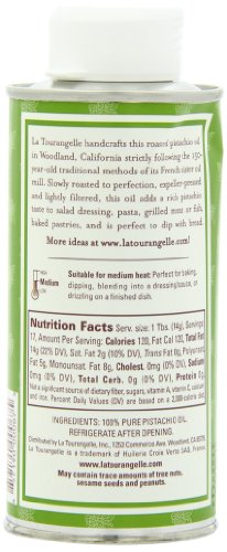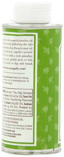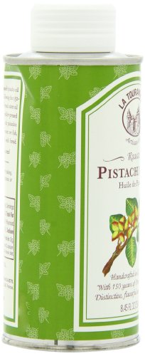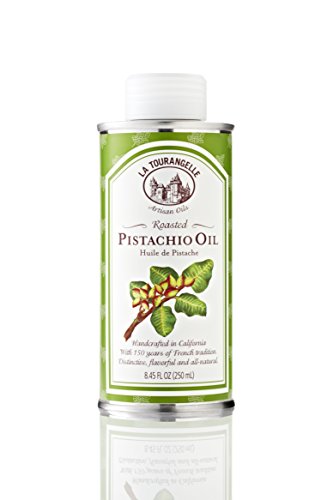 -. Feature : Pistachio oil is a delicious and easy-to-use oil. In salads, pistachio oil mixes very well with balsamic vinegar or red wine vinegar to create a simple but flavorful vinaigrette / Also try it with tarragon white vinegar. It is also delicious on grilled fish or meat: A dab of pistachio oil is the perfect touch for enhancing flavors and easing digestion when added towards the end of your beef bourguignon or meat dishes / You can also try it in pasta with cheese. Don't hesitate to use it in cakes and baked goods, particularly with apples or pears. / La Tourangelle is the first oil mill in California to produce pistachio oil using traditional French methods. After harvesting, the nuts are washed, sorted, sun-dried for several days and stored for further drying. / The oil has an intense pistachio flavor and luxurious, dark green color