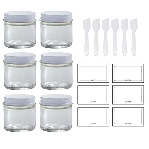 - Includes 6 - 30 ml / 1 oz Clear Glass Straight Sided Jars with White Metal Lids + Spatulas and Labels