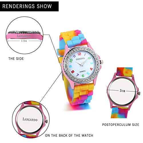 Brand, Seller, or Collection Name:Lancardo Part Number:LCD100425 Model Year:2017 Item Shape:Round Dial window material type:Glass Display Type:Analog Clasp:Buckle Case material:Plastic Case diameter:1.50 inches Case Thickness:0.30 Band Material:Silicone Band length:Unisex Band width:0.80 inches Band Color:Rainbow Dial color:White Bezel material:alloy Special features:Prefect gift choice Movement:Quartz