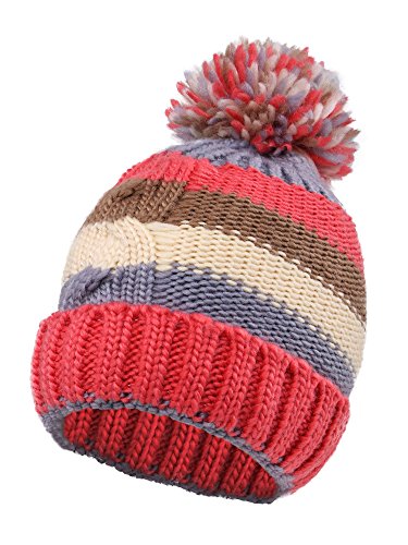 Arctic Paw Kids' Super Chunky Striped Knit Beanie with Yarn Pompom Cap,Red Striped 2