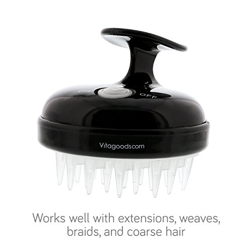 Apply a small amount of your favorite shampoo to your scalp and distribute through the roots of your hair.Press the On/Off button to activate the vibration to desired speed on your Vitagoods Scalp Massaging Shampoo Brush. Hold the massager in the palm of your hand with the rubber tips facing away from you and the handle in between your index and middle fingers for a firmer grip and better control. Starting at the front of your head, slowly move the shampoo brush over your entire scalp, using as much or as little pressure as you’d like, and taking care to spend extra time on areas where you may have noticed flaking or dry scalp. Note: If you have long hair, take care not to pull through the length of your hair. When finished, press the On/Off button to deactivate the vibration, and rinse any shampoo suds or residue from the rubber tips.