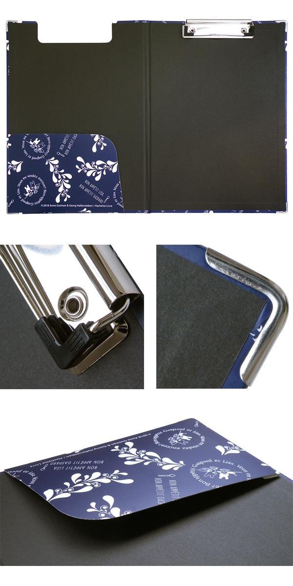 | A4サイズ対応、360度折り返せて書きやすい!!表面にPP加工を施し、水・汚れに強くしております。クリップには滑り布止め、角潰れ防止にスチールガードを取り付けています。内側ポケット付き♪ |