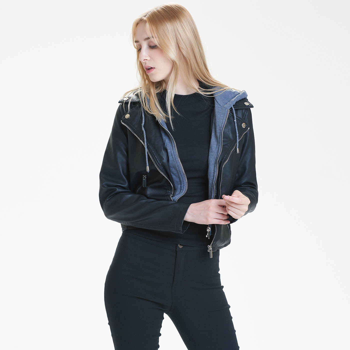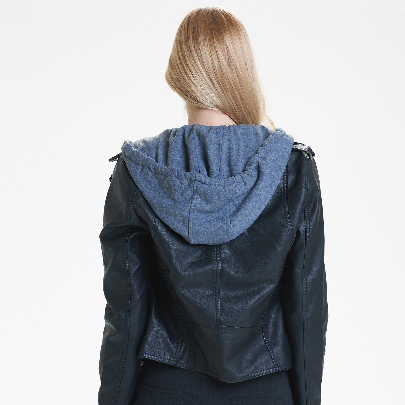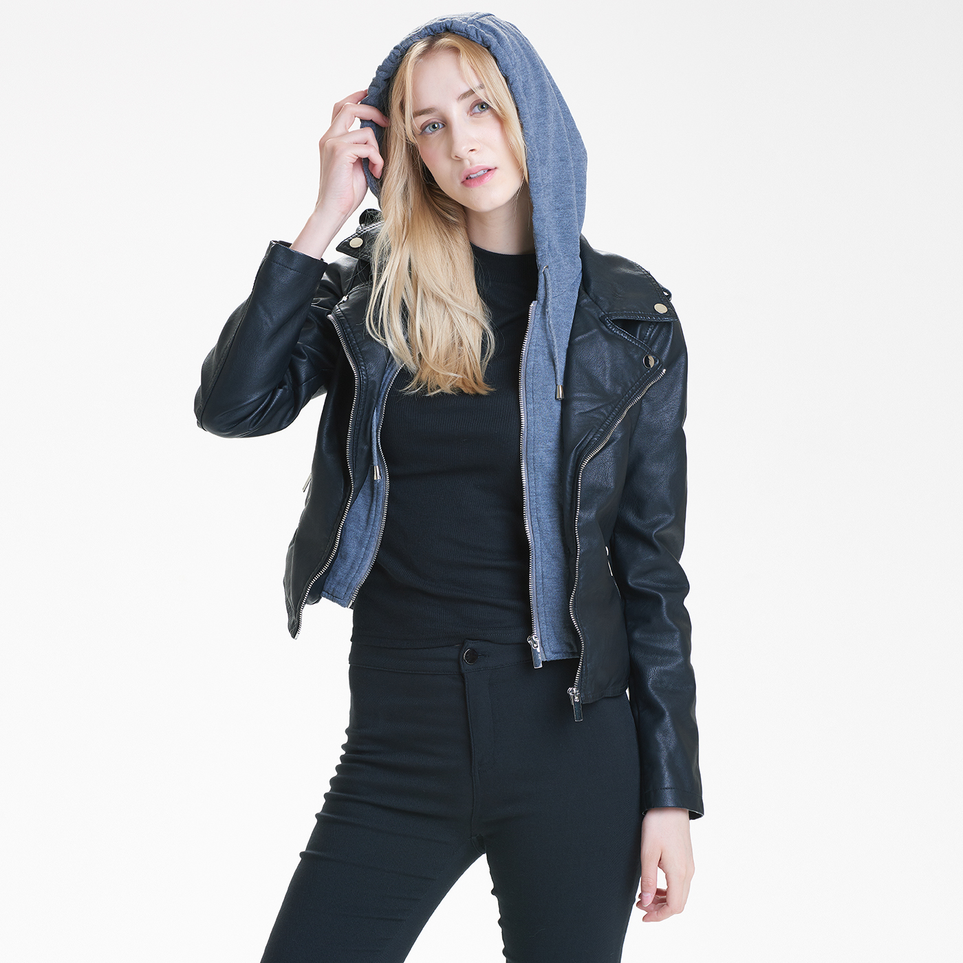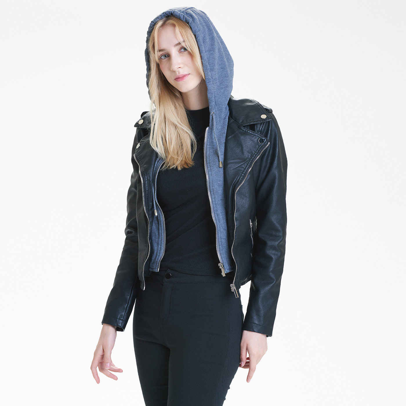 후드가 달린 고급 인조가죽의 라이더자켓입니다.역동적이면서도 프리티한 디자인입니다.