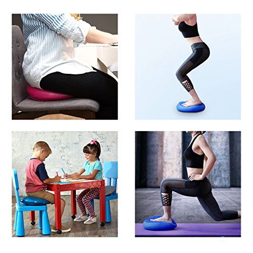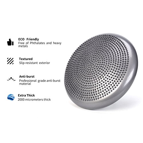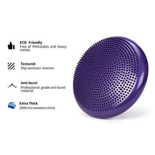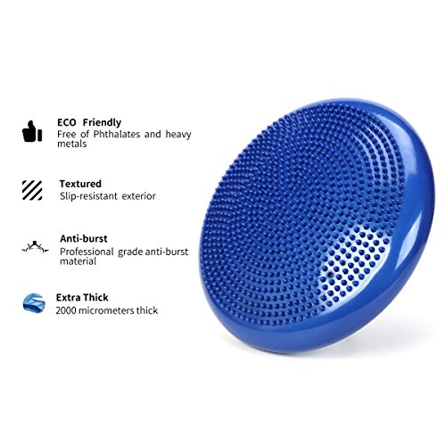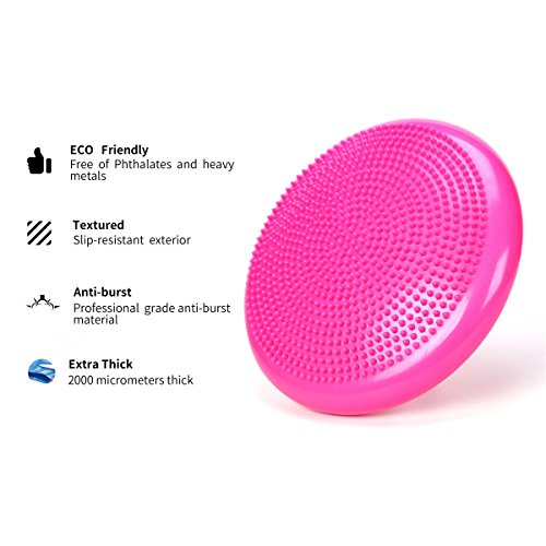 Our balance disc are premium quality, with a number of key benefits: Strengthen the core stability muscles to relieve neck and back pain maximize massage effect. Improve balance, coordination and flexibility?burns more calories. Great to support the spine, keep the right posture sitting in office chair all day long?also effectively help children stay focus and sit still. Great for foot massage, used as mini-stepper for exercises?cardio, strength, yoga, sports and injury recovery.