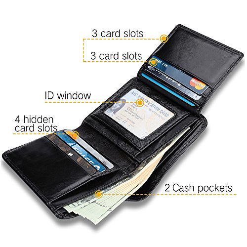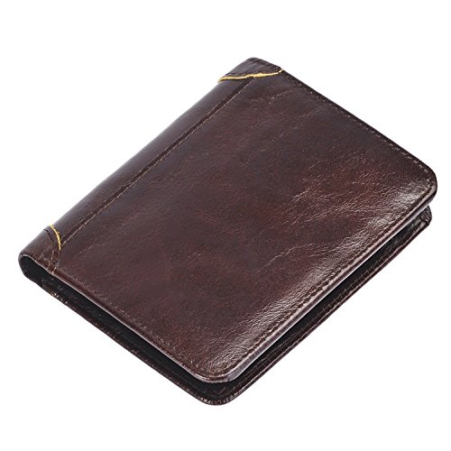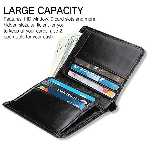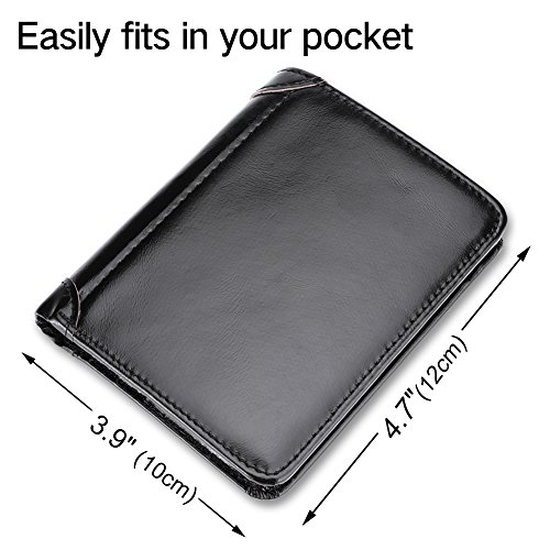 -. Feature : High Quality Material-----Geniune Leather / Easy to Take-----Fit for your most Pant Pocket. T*W*H: 4.6*3.8*0.8(in) / Roomy Compartments----With 9 Credit Cards Holder, 1 Clear ID Window, 5 addition slots. / ✔Practical-----COMPACT design, goes great to your everyday life, travel and enjoy shipping, working at office