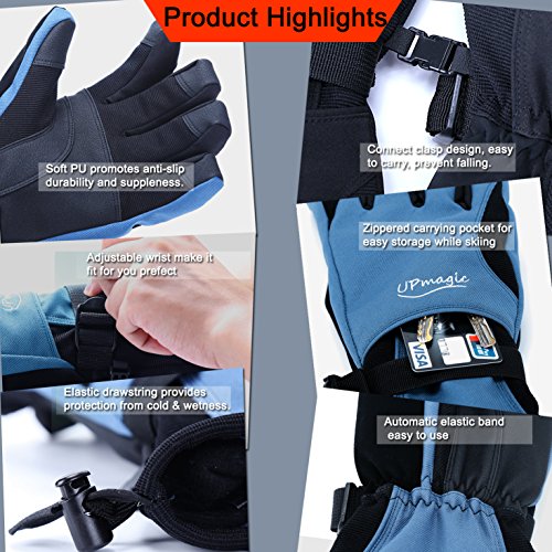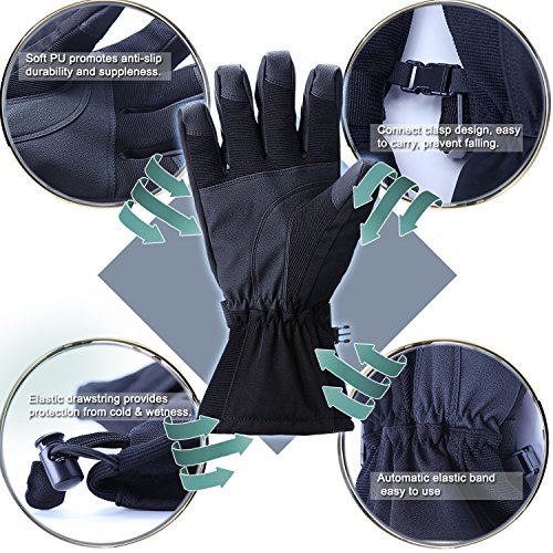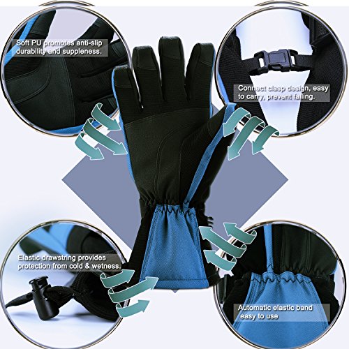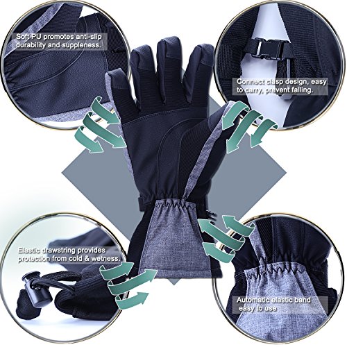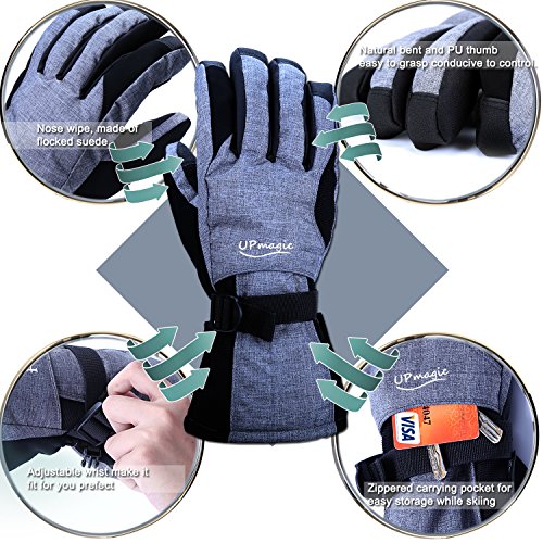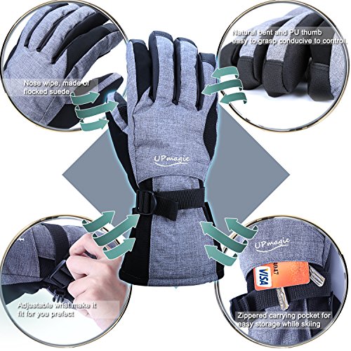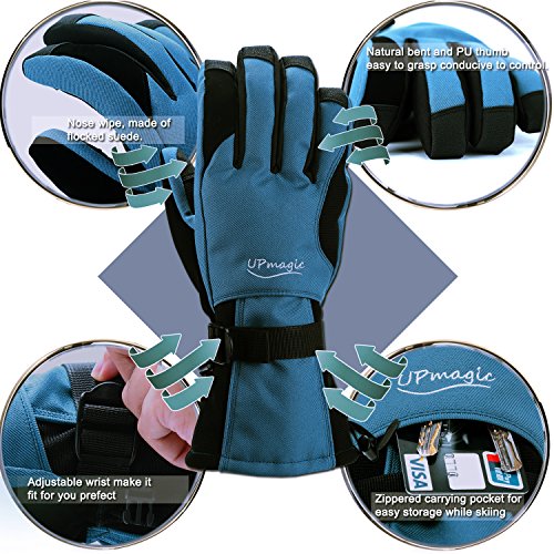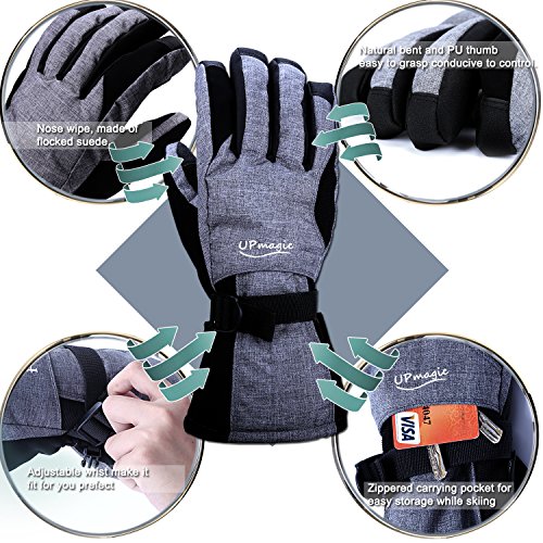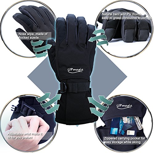 ? WHY CHOOSE US: ♥ Extra Warm: 40g of 3M's super-efficient and windproof Thinsulateinsulation is lighter, thinner, and warmer than the competition to ensure optimal mobility and dexterity, keep hands warmer and cool when you skiing. ♥ Waterproof and windproof: Three layers softshell and insert TPU membrane provides entirely guards to keep hands warm and dry in snowsports at outdoors. ♥ Zippered pockets: This pocket is easy to carry keys, ID cards or litter cashes as well as smaller size gloves warmers. ♥ Nose wipe: The back of the thumb and index finger are covered with flocked suede, Soft, you can wipe your nose when you have a runny nose in cold weather. ♥ Ergonomic design: Oxford fabric makes more soft and natural bent fingers, easy to grasp, conducive to control. ♥ PU palm: Reinforced Palm Fingertips high performance wear resistant and increase the friction.