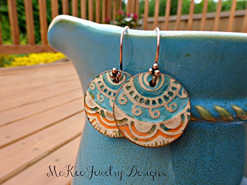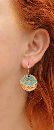 -. Title : Round hand painted leather and copper metal earrings. Turquoise and orange.