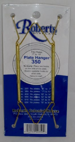 -. Binding : Kitchen -. Brand : Roberts -. Color : Copper -. EAN : 0752029917172 -. Feature : Metal Plate Hanger fits 7 / Holds your plate tight to hanger / Easy to hang, fits plates 7 inches to 10 inches / Brass spring tension wire / Made in Taiwan, new, unopened -. Label : Roberts -. Manufacturer : Roberts -. ProductGroup : Home -. ProductTypeName : HOME -. Publisher : Roberts -. Studio : Roberts -. Title : Roberts Colonial Metal Plate Hanger 7 -. UPC : 752029917172
