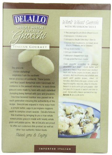 -. Binding : Grocery -. Brand : DeLallo -. EAN : 0072368510620 -. Feature : Serve them with a traditional sauce or olive oil and grated Parmigiano-Reggiano for a quick first course or satisfying lunch / Our Whole Wheat Potato Gnocchi are made in the time-honored way, infusing each compact round with fine texture and delicious potato flavor, but the wheat is left to be whole to provide a greater wholesomeness & health benefits to this fine dish -. Label : DeLallo -. Manufacturer : DeLallo -. MPN : 072368510620 -. NumberOfItems : 6 -. PackageQuantity : 6 -. PartNumber : 072368510620 -. ProductGroup : Grocery -. ProductTypeName : GROCERY -. PublicationDate : 2010-10-13 -. Publisher : DeLallo -. Studio : DeLallo -. Title : DeLallo Whole Wheat Potato Gnocchi, 16 Ounce Boxes (Pack of 6) -. UPC : 072368510620