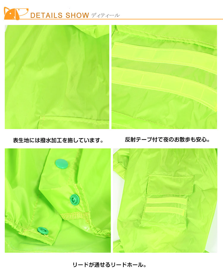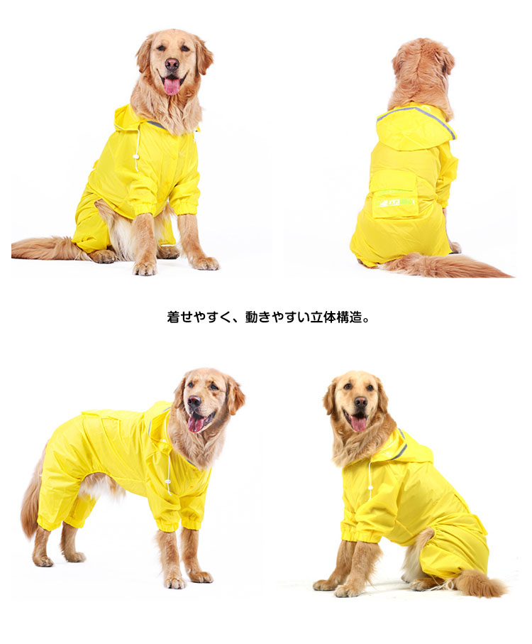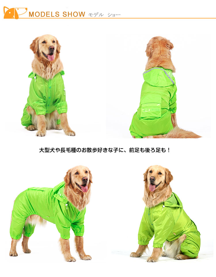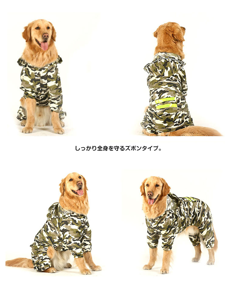 | 大型犬や長毛種のお散歩好きな子に、前足も後ろ足も!しっかり全身を守るズボンタイプ。着せやすく、動きやすい立体構造。雨の日や雨上がりのお散歩に! | |