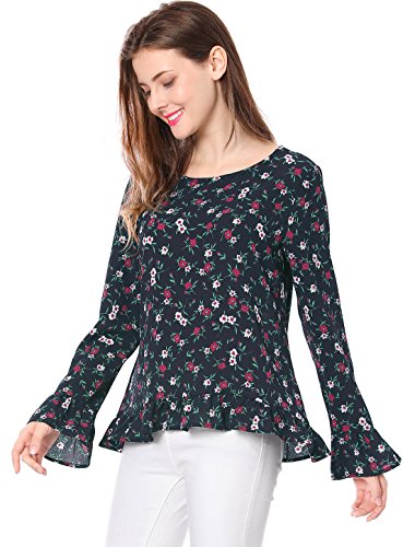 -. Title : Allegra K トップス ブラウス 花柄 ベル袖 長袖 ラウンドネック フリル裾 軽量 レディース