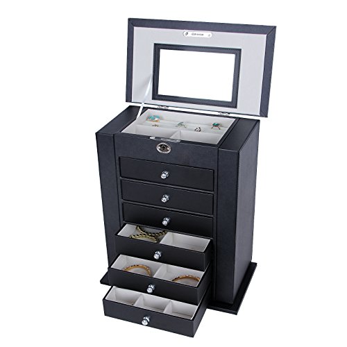 - Feature : Excellent craft with black faux leather surface and cream velvet lining / Features 6 versatile pull out drawers and lift lid with interior mirror / Locking top compartment with 2 sections and ring rolls / 2 hidden slide-out necklace doors with 5 hooks & 1 pocket each / Dimensions (L x W x H): 10.8" x 6.3" x 14.2"( 27.5 x 16 x 36 cm)