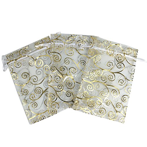 SUNGULF 100Pcs Sheer Organza Drawstring Pouches Vine Wedding Gift Bags 3x4 Inches (Gold Silver)