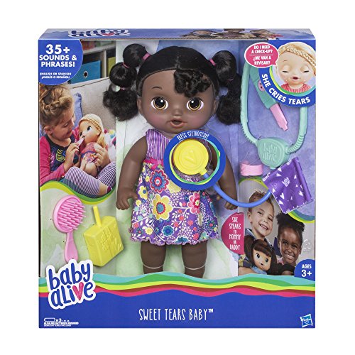 ReleaseDate : 2017-06-01 Studio : Hasbro Publisher : Hasbro Binding : Toy Product Description A sick baby needs lots of love to bounce back to their normal smiles and giggles. Kids can nurture the Sweet Tears Baby doll to help her back to health. First, fill her "juice" box with water to feed her. . .oh no! She cries tears that mommy or daddy can wipe away. The Sweet Tears Baby doll has an expressive face and responds to her accessories. Kids can give Sweet Tears Baby doll a check-up with the stethoscope and thermometer. Her nose lights up to let kids know she needs her tissue. Pretend to blow her nose or bandage a pretend boo-boo. Flip the switch in her back to choose who she's speaking to -- she says "Mommy" and "Daddy" so girls and boys can play out nurturing moments. With 35 plus sounds and phrases in English or Spanish, she can tell kids how she's feeling. . .and that she loves them! Baby Alive and all related properties are trademarks of Hasbro. 0