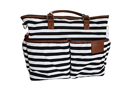 [Description] BEST DESIGN FOR STYLISH MOMS EVER - Stylish_ beautiful_ perfect size_ wonderful design and details! 13 BEST DESIGNED POCKETS -Two large front pockets provide moms easy access to more frequently needed items. One large back pocket is for mom to carry IPAD_ books_ cellphone and keys. Two side pockets are insulated and designed to hold your baby``s bottles and sippy cups. Six pockets inside the bag are for diapers_ wipes_ bibs_ clothes_ sanitizer_ tissues_ and sunscreen cream etc. There is a zippered compartment to protect mom``s personal items including wallets. SUPER PRACTICAL REMOVABLE STRAPS /ITEMS - This diaper bag has beautiful handles so you can carry it by hands or your arm. It also comes with removable shoulder straps that turns this bag into a crossbody/shoulder tote bag with no time. You can also remove shoulder straps and attach two smaller removable stroller straps to the bag as well as your stroller. It will turn this bag into the most beautiful stroller organizer. The bag comes with a matching baby changing pad as well. PREMIUM MATERIAL HIGH QUALITY STITCHING - This stylish diaper bag is made of beautiful_ durable_ premium cotton canvas with great quality stitching and binded edges. Handles and bottom of the bag are made of stylish PU leather for added beauty and easy cleaning. MULTIPLE BEAUTIFUL COLOR OPTIONS AND BAG SIZE- Multi-color options are available - choose among black/white striped_ brown/white striped_ grey/white striped and red/white striped to match your favorite outfit! Bag size is 43*34*13 cm (16.9 *13.4*5.1 in). BEST DESIGN FOR STYLISH MOMS EVER - Stylish_ beautiful_ perfect size_ wonderful design and details. PREMIUM MATERIAL HIGH QUALITY STITCHING - This stylish diaper bag is made of beautiful_ durable_ premium cotton canvas with great quality stitching and binded edges. Handles and bottom of the bag are made of stylish PU leather for added beauty and easy cleaning. Hand wash is recommended.