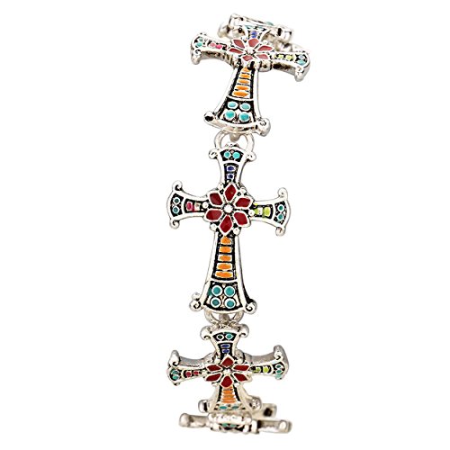 -. Feature : Mosaic style design cross charm link bracelet / Repeating sideways cross in silver tone with multi-color enamel detail / Bracelet length 7.5" / Fold over magnetic clasp closure / A lovely inspirational gift for someone special
