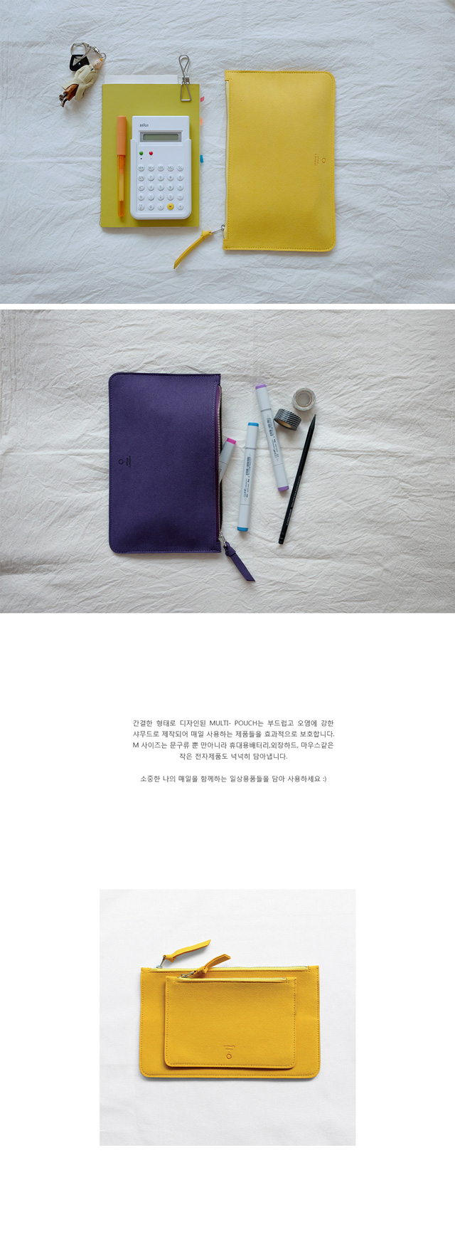 간결한 형태로 디자인된 MULTI- POUCH는 부드럽고 오염에 강한