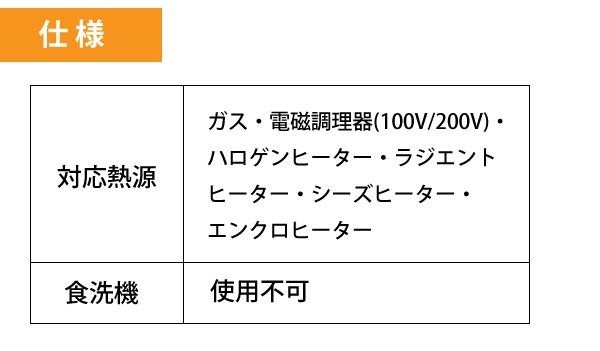 | 仕様 | 対応熱源:ガス・電磁調理器(100V/200V)・ハロゲンヒーター・ラジエントヒーター・シーズヒーター・エンクロヒーター 食洗機:使用不可 |
