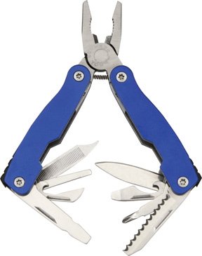 Studio : Schrade Publisher : Schrade Product Description Schrade Small Tough Tool Blue. 2 5/8" closed. Features stainless pliers, nail file/cleaner, flat and Phillips screwdrivers, bottle opener, can opener, blade, saw blade and reamer. Anodized blue aluminum handles 0