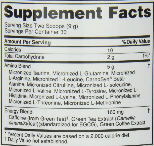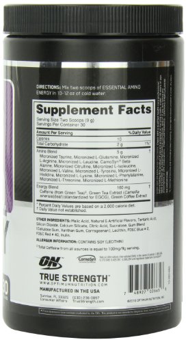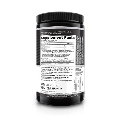 Studio : Optimum Nutrition Publisher : Optimum Nutrition Binding : Health and Beauty Product Description There are times when you want a hefty dose of caffeine for pre-workout performance. But on other occasions, like first thing in the morning or a late afternoon pick-me-up, what you’d get from a cup of coffee is more appropriate. ON’s Essential Amino Energy offers the best of both with a formula that delivers 100mg of caffeine from natural sources per 2-scoop serving. Decrease or increase the energy level as the occasion demands. Each serving provides 5 grams of micronized amino acids. 0