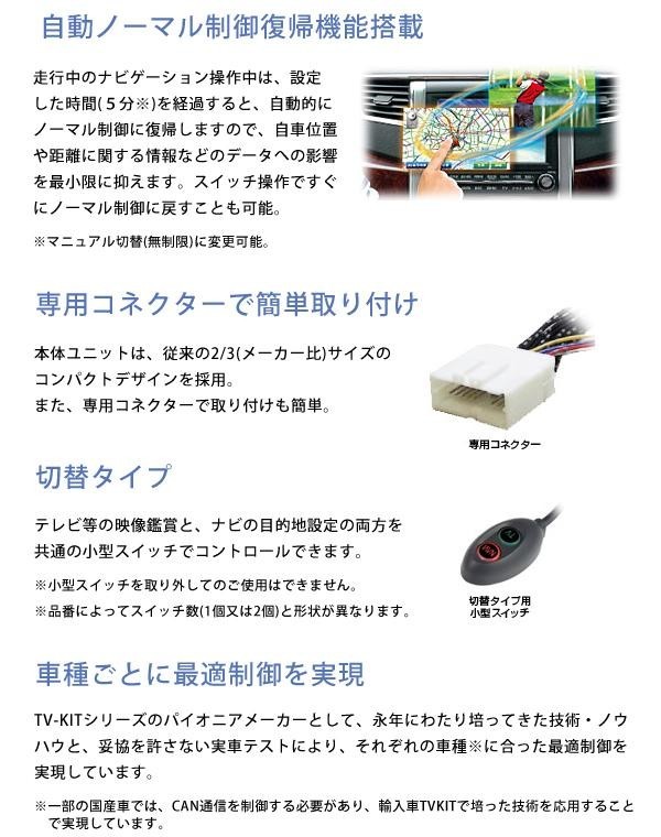 | 仕様 | スイッチ形状:2個スイッチ又は1個スイッチ スイッチの設置:必要 スイッチ操作/テレビ視聴時:必要・ナビ操作時:必要 ノーマル復帰 ナビの自車位置(製品使用時)/テレビスイッチON時:正常・ナビスイッチON時:△ ナビ操作(タッチパネル操作):○ ※メーカーホームページ要確認 |