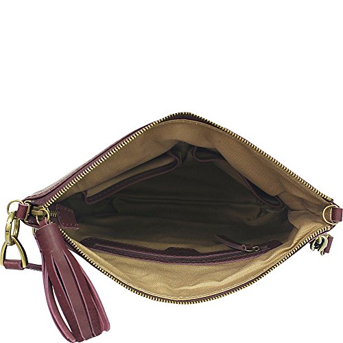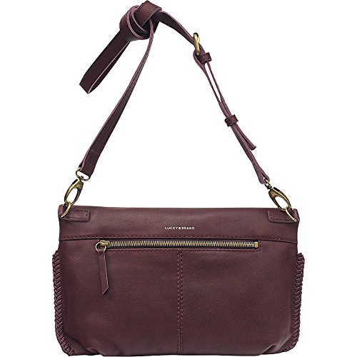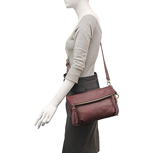 Cross-body handbag featuring braided side seams and foldover zippered top with tassel pull
