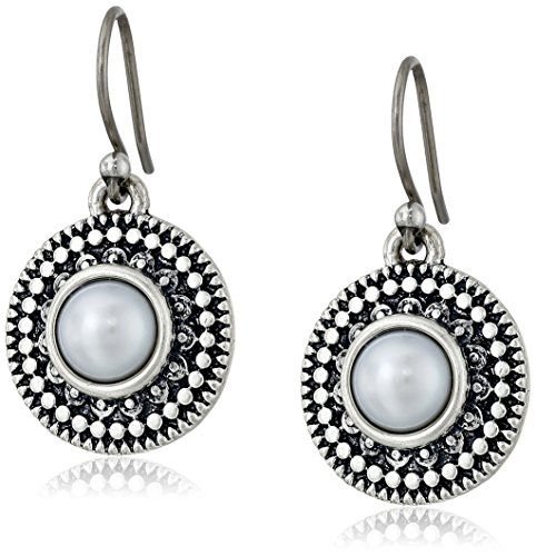 -. Feature : Earrings featuring textured round medallions with bezel-set pearlescent rounds at center / Fishhook backings / Imported
