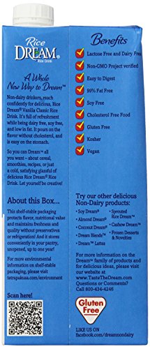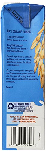RICE DREAM Classic Vanilla Rice Drink, 32 Fluid Ounce. Non-dairy drinkers, reach confidently for delicious Rice Dream Vanilla Classic Rice Drink. It's full of refreshment while being dairy free, soy free, and low in fat. It pours on the flavor without cholesterol, and is easy on the stomach. So you can Dream all you want - about cereal, smoothies, recipes, or just a cold satisfying glassful of delicious Rice Dream Rice Drink. Let yourself be creative. This shelf-stable packaging protects flavor, nutritional value and maintains freshness and quality without preservatives or refrigeration. And it stores conveniently in your pantry, unopened, up to one year.