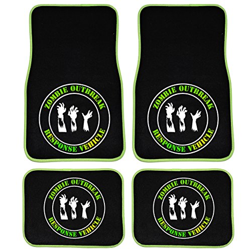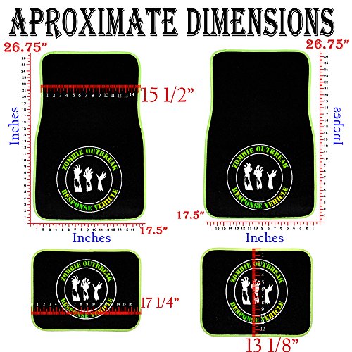 -. Brand : U.A.A. INC. -. Feature : 2 Front Mats Approximate Dimensions 17 1/2 in x 26 3/4 in / 2 Rear Mats Approximate Dimensions 17 1/2 in x 13 1/8 in / Floor Mats Are durable carpet mats and Comes with back Nibbes to keep carpet in place. Logo is made out of PVC Patch. / Great way to personalize your vehicle interior and at the same time help keep clean carpet. / Helps to protect your vehicle interior floor from Dirt, mud, dust, and any other element. -. Label : U.A.A. Inc. -. Manufacturer : U.A.A. Inc. -. ManufacturerPartsWarrantyDescription : Parts -. PackageQuantity : 1 -. ProductGroup : Automotive Parts and Accessories -. ProductTypeName : AUTO_ACCESSORY -. Publisher : U.A.A. Inc. -. Studio : U.A.A. Inc. -. Title : Zombie Outbreak Response Vehicle Black Universal Carpet Floor Mats for Car Truck