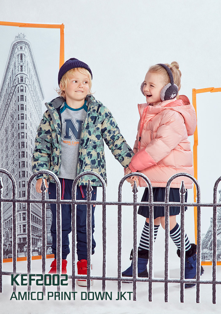 - 덕 80:20 - 토들러 전용 다운 -시즌 패턴물을 전판 프린트 및 유니크한 메탈릭느낌의 멜란지로 제안하는 토들러 전용아이템 - 풀러 및 홀로그램 와펜으로 포인트를 줌 - 후드 안쪽과 에리안쪽에 플리스 원단을사용하였고 안감 등쪽에는 발열 안감을 적용하여 보온성 높임 - 소매부분에 벨크로 처리로 사이즈 조절 및 활동성 높임 - 키즈의 안정성 고려하여 부드러운 타입의 벨크로 사용함