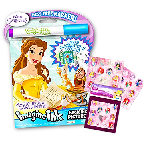 Disney Princess Imagine Ink mess-free picture book set featuring favorite Disney Princess characters including Cinderella, Snow White, Jasmine, Belle, Ariel and more! The set features Disney Princesses in a 24-page picture book, 1 mess-free Imagine Ink Marker, and a Disney Princess sticker book with over 100 stickers! The Disney Princess Imagine Ink picture book uses a mess free marker to reveal a rainbow of colors as you draw on the page. Designed to be used with the included Magic Ink Marker, a clear marker that will not visibly mark most other items. The Disney Princess sticker book includes over 100 Disney Princess stickers featuring Cinderella, Snow White, Ariel, Belle and other favorite princesses. These Disney Princess stickers are prefect for reward stickers, motivational stickers, party supplies, party favors and more. Perfect for travel and on-the-go fun. Great fun for any little Disney Princess fan!Feature