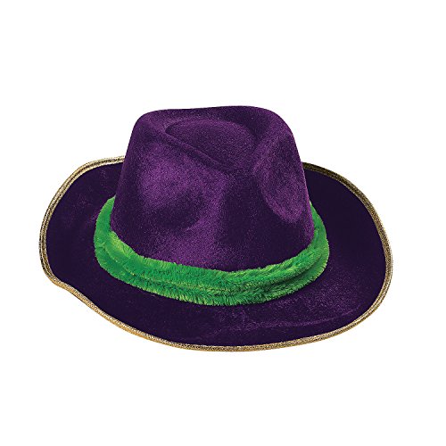 -. Feature : Velvet felt Mardi Gras fedora hat / Ideal for Mardi Gras, Halloween, costumes / Adult size hat is approx. 24" in circumference / Purple hat with gold trim and soft plush green band / Fun novelty hat