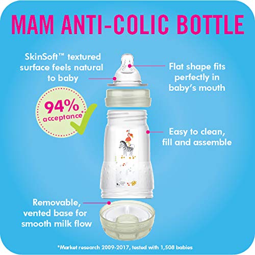 MAM Anti-Colic Baby Bottlesは、授乳中の赤ちゃんやフォーミュラで育てられた赤ちゃんにとって理想的な哺乳瓶です。母乳のように感じるように設計されたSkinSoft TMニップルを搭載して、母乳育児と瓶授乳を切り替えるのは簡単で簡単です。さらに良いのは、94%*の赤ちゃんがそれらを喜んで受け入れ、飲んでいます。これをMAM Anti-Colic Baby Bottlesの高度なアンチコリックデザインシステムと組み合わせることで、疝痛、ガス、逆流の症状を軽減できます。
