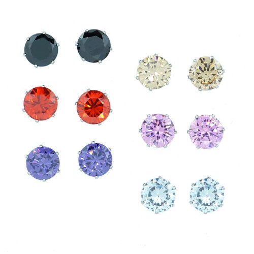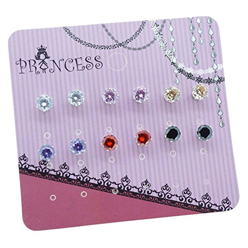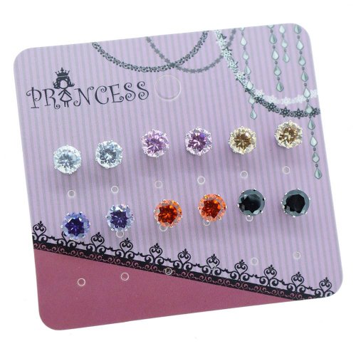 New 6 Pairs of Color Cubic Zirconia Crystal Magnetic Stud Earrings. Brand new and never use before. 6mm Round Cut Cubic Zirconia, Brass with platinum plated . Pack of 6 Pairs with "Princess" Earring card as picture shown.Feature