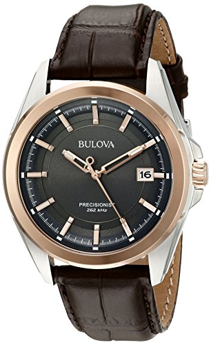 -. Feature : Stainless steel screw-back case in silver-tone and rose gold-tone finish and gunmetal grey dial, flat mineral glass / Powered by Bulova's proP.R.Ietary, high-performance UHF quartz movement, with a vibrational frequency of 262kHz-eight times greater than a standard quartz movement for unparalleled accuracy / Quartz Movement / Case Diameter: 43mm / Water Resistant To 100m (330ft): In General, Suitable for Swimming and Snorkeling, but not Diving