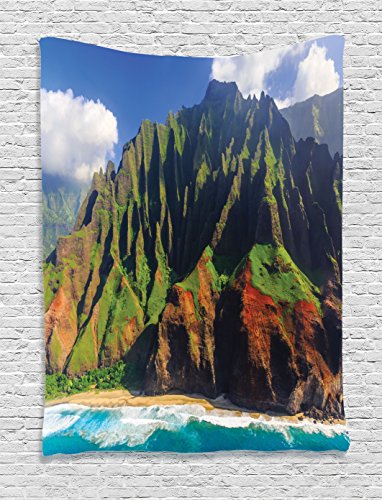 Hawaiian Decorations Tapestry by Ambesonne, Aerial View Of Na Pali Coast Kauai Hawaii Mountain Cliff Seacoast Scenic Photo, Bedroom Living Room Dorm Decor, 40Wx60L Inches, Green Brown